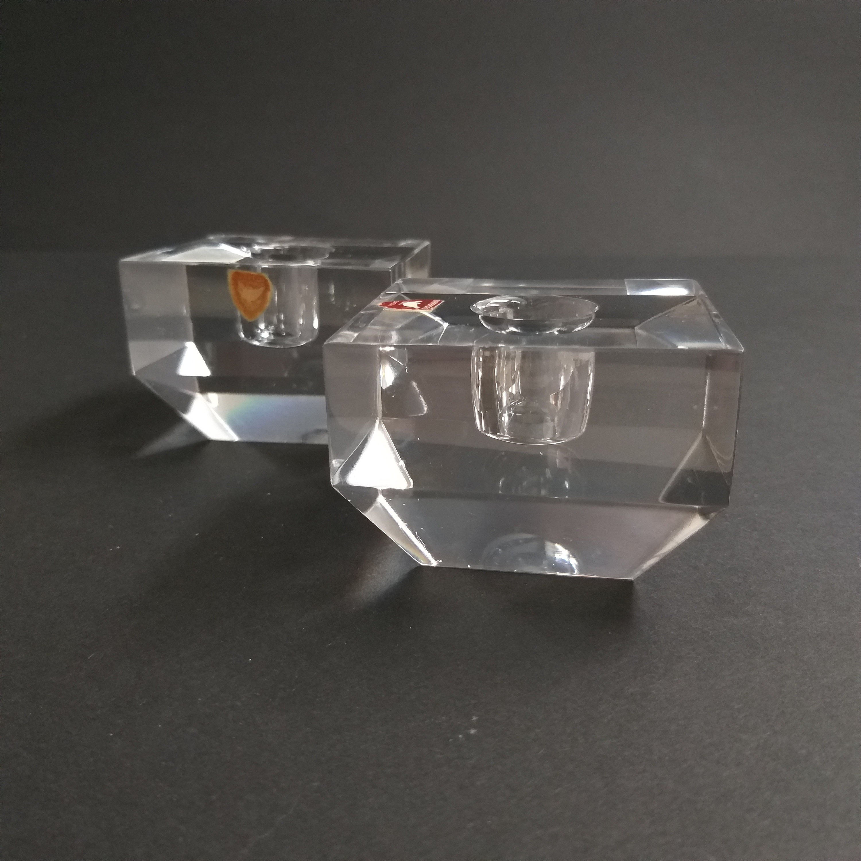Orrefors Sweden. A pair of Surprisingly Clear and Sparkling Faceted Candlesticks. Square Shape. Swedish Vintage Art Glass. Classic Design. It has a tiny Fleabite on the lover Side Edge of one Candlestick (last picture). It doesn't affect their Brilliant Look. Amazing Orrefors Quality from their Precious Range. Signed. Quite Heavy. Original Label.