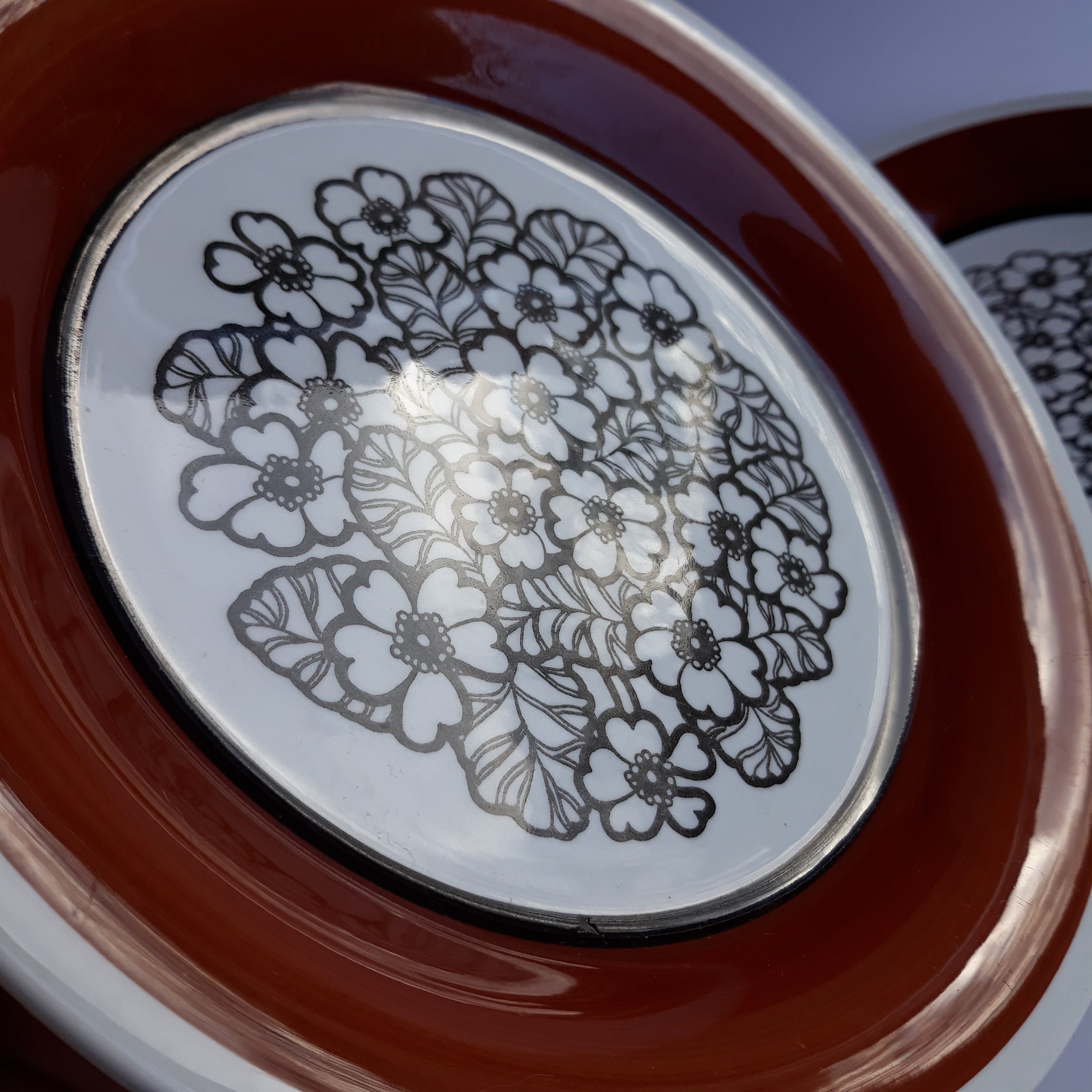 Set of 3 Agneta Gefle Plates. Swedish Tableware from 70s. Scandinavian Design by Helmer Lindström. Vintage Plates - Brown Rim and Flowers.