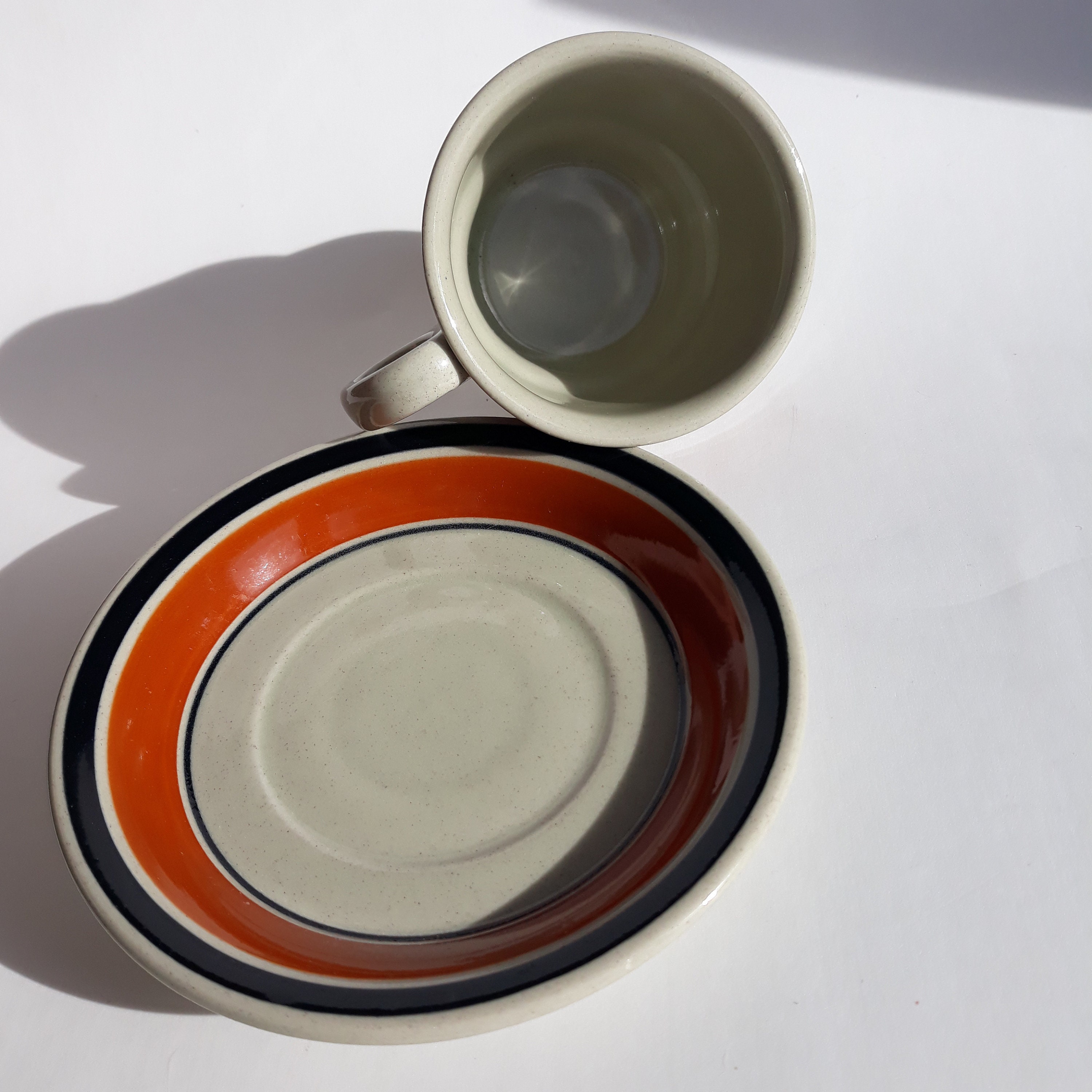 Hoganas Keramik Sweden. Stoneware Rand-Banda Coffee Cup and Saucer. Terracotta, Black Colour Borders. Vintage Swedish Design Tableware.