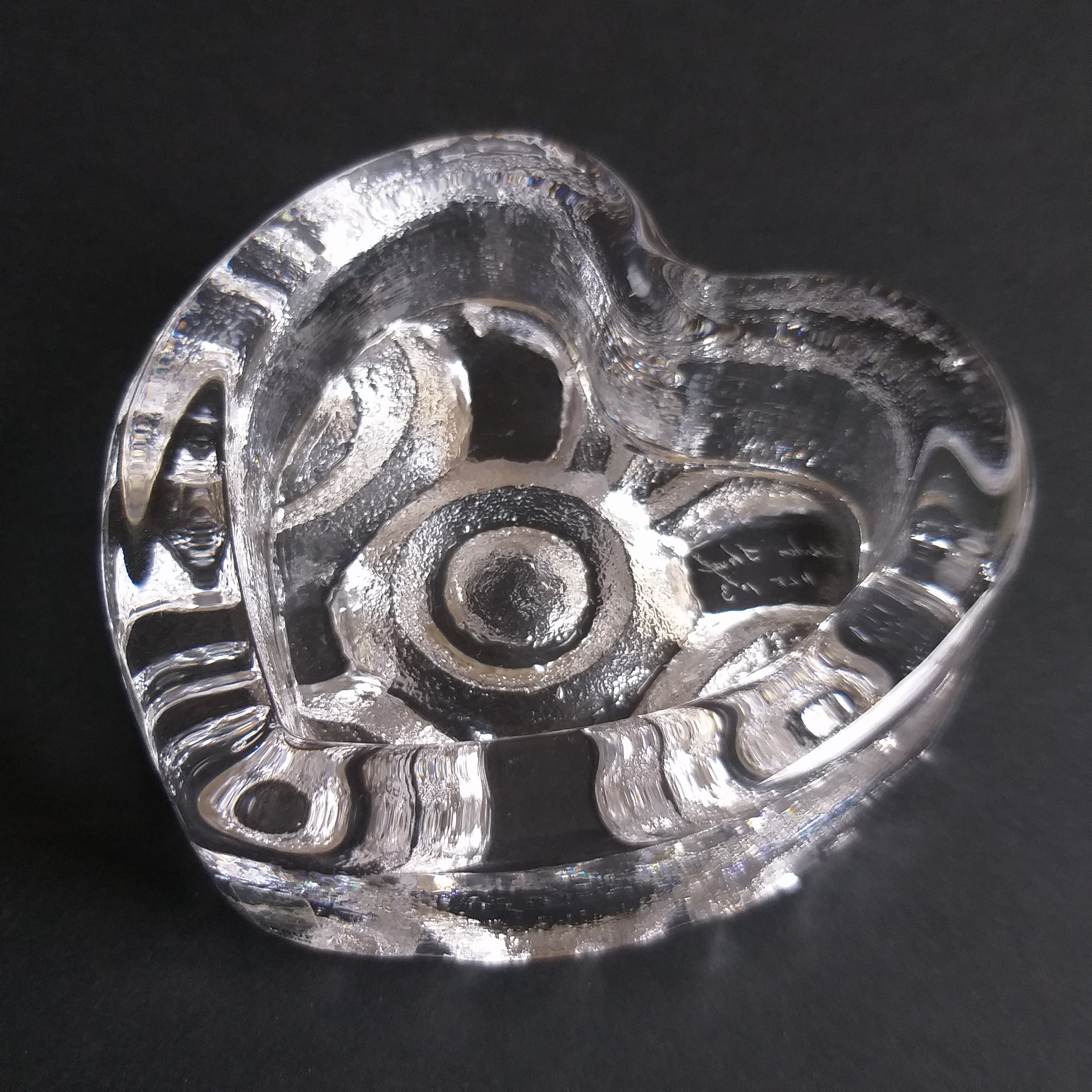 Scruf Glassworks Sweden Crystal Trinket Dish. Design by Lars Hallsten. Textured Clear Crystal Glass in Shape of Heart. Scandinavian Design.